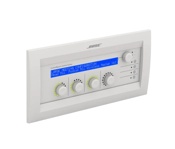 Le centre de contrôle Bose Professional ControlSpace CC-64 est un contrôleur élégant, programmable et en réseau qui fournit aux utilisateurs une interface simple et logique à leurs systèmes de son lors de l’utilisation de processeurs ControlSpace ESP et/ou d’amplificateurs PowerMatch en version réseau. Parce que le contrôleur est entièrement programmable, vous pouvez personnaliser le système de son, en ne rendant disponibles que certaines commandes et en simplifiant l’interaction de l’utilisateur avec le système.